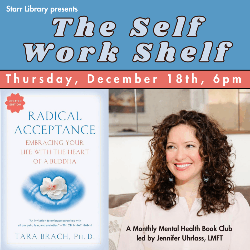 “Believing that something is wrong with us is a deep and tenacious suffering,” says Tara Brach at the start of this illuminating book. This suffering emerges in crippling self-judgments and conflicts in our relationships, in addictions and perfectionism, in loneliness and overwork—all the forces that keep our lives constricted and unfulfilled. Radical Acceptance offers a path to freedom, including the day-to-day practical guidance developed over Dr. Brach’s forty years of work with therapy clients and Buddhist students. Book discussion group led by LMFT Jennifer Uhrlass.