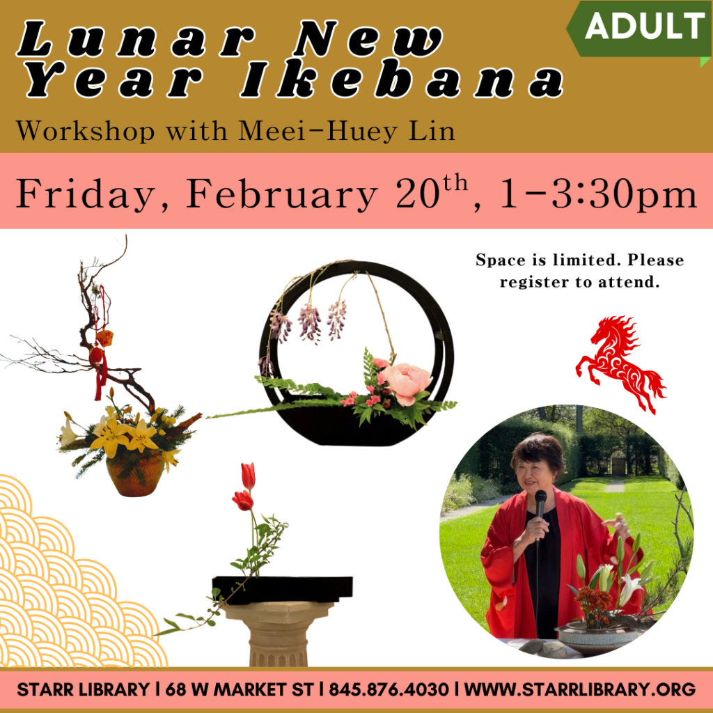 Lunar New Year is widely celebrated in most Asian countries and considered the most important holiday of the year. In this class, Meei-Huey will open with a brief explanation of Ikebana, the art of Japanese flower arranging. Please bring gardening shears, scotch tape. All other materials will be provided. Space is limited to 12 people. No prior experience required. Beginners welcome.