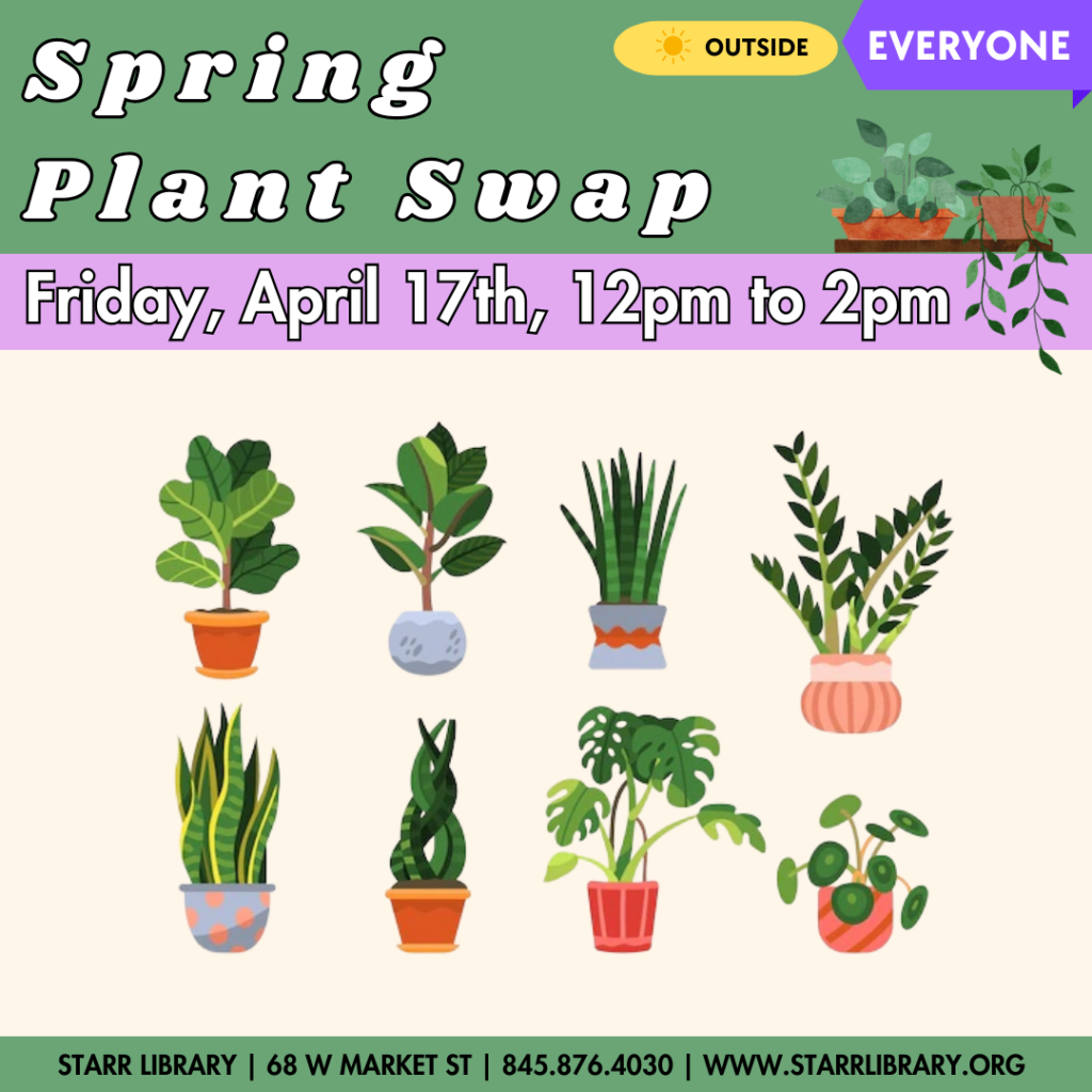 Do you have a cutting of a houseplant you’d like to share with others? Come with a cutting or two, and leave with something new to add to your collection! Are you preparing to plant seeds, shrubs, or bulbs and have some to spare? Bring those too! Drop in anytime between 12pm and 2pm. Please label whatever you bring and provide care/rooting instructions.