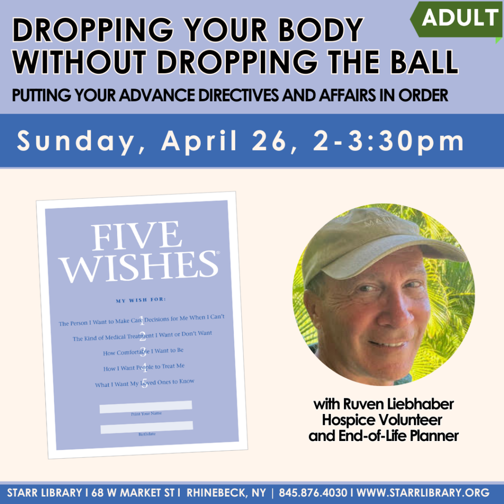 In this workshop we will explore Advance Directives using the Five Wishes document and the Compassion and Choices “My End-of-Life Decisions” resource. We will also go through a checklist to organize your personal matters, legal documents and financial information. As an initial overview, the workshop will get you more fully aware and on your way.