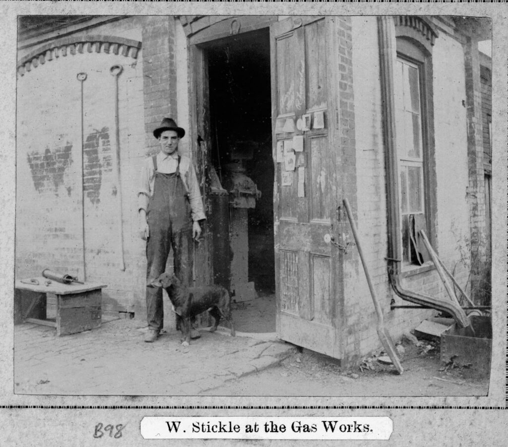 Leaning against the dusty brick building that houses the gas works, W. Stickle wears overalls, a hat, and a cotton shirt. A dog poses with him.